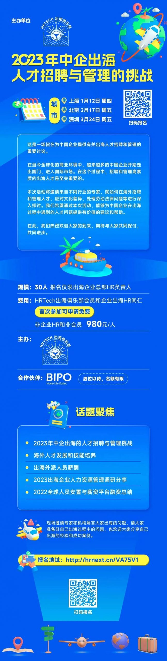 近期,由HRTech出海俱乐部主办的【2023年中企出海人才招聘与管理的挑战】私享会将在上海、北京、深圳举办