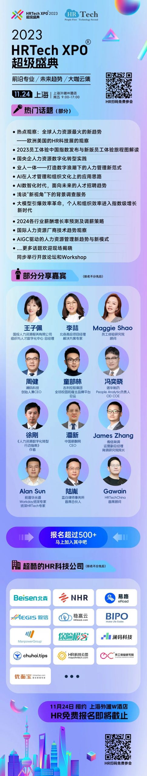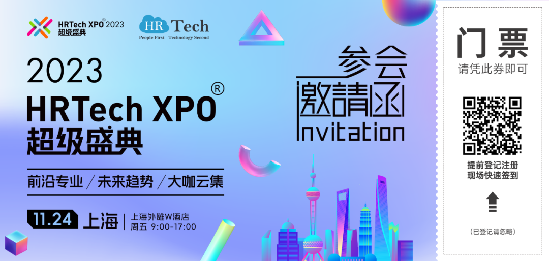 同期举办玩转能量沙盘,2024探索HR无限可能Worshop会场中我们鼓励互动交流,但是坚决制止未经允许的商业推广行为(如现场发放名片、逐个要求换微信,提供微信群等)。同时,主办方不会在现场组建微信群、小程序等,请注意甄别,随时可以跟我们反馈,保护自己的信息安全。请关注HRTechChina微信公众号作为唯一信息途径。会议核心互动会通过微信公众号完成(论坛日程、参会守则、照片直播、云图新版等)2023HRTechXPO未来人力资源科技论坛——邀您先一步看到未来现场相约500+HR科技同仁,部分来自宜家、菲斯科软件、特斯拉、美团、纳宝蒂、联通上海、宝茂投资、易鑫集团、优米汽车、诺华制药、傲胜中国、光明食品、豪利士、宝洁、富民银行、住总集团、罗姆化学、翠丰集团、施耐德电气、药明康德、海康威视、同济建设、卫龙、道达尔、赫比、乐众信息、阿维塔新能源、申能集团、同程旅行、太安堂药业、金光纸业、万向、闪送、浩鲸云、上海电气、浦发硅谷银行、海尔集团、兴业证券、三花控股、HSBC、英格尔检测、泰康保险集团、素然服饰、风涌云动、GE、商汤、马克华菲、圣象家居、塔塔信息、上海证券、吉利、GSK、国泰产险等等