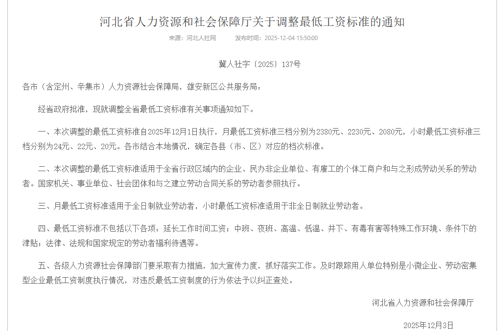 12月4日,河北省人社厅发布《关于调整最低工资标准的通知》,本次调整的最低工资标准自2025年12月1日起执行。