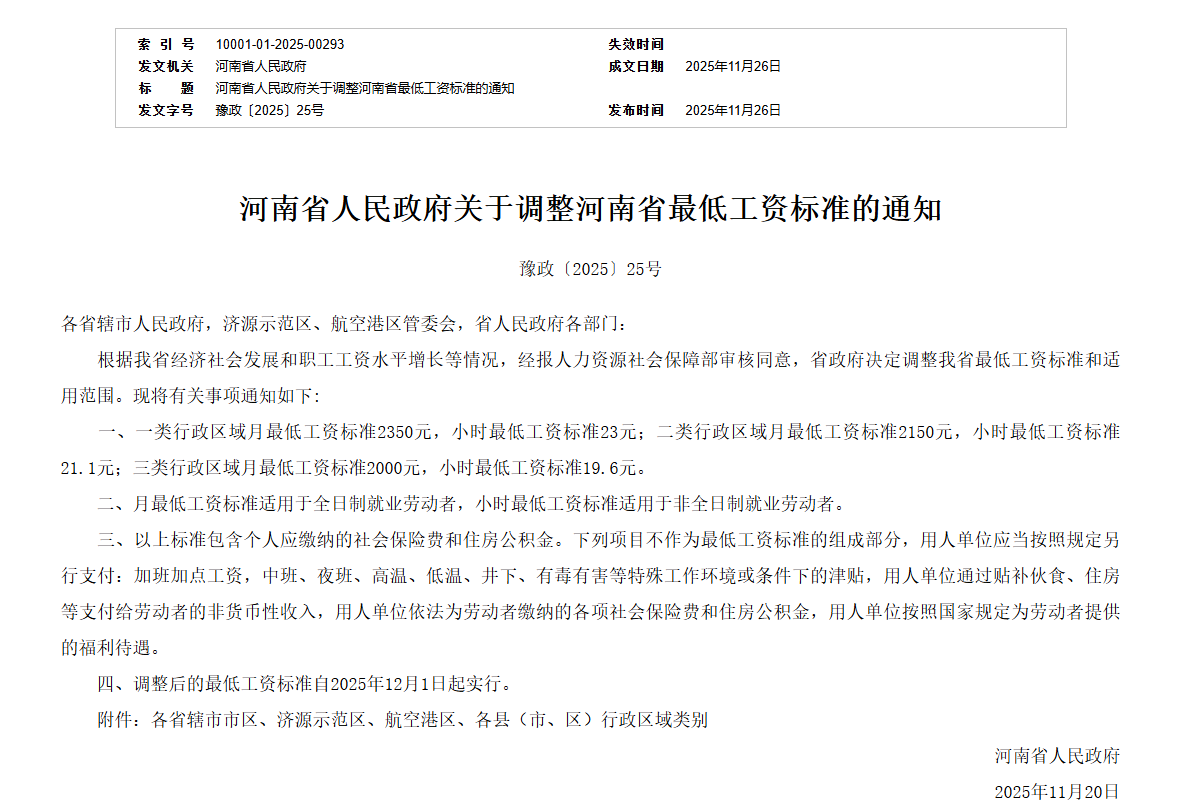 河南省人民政府印发《关于调整河南省最低工资标准的通知》,决定自2025年12月1日起调整全省最低工资标准和适用范围。