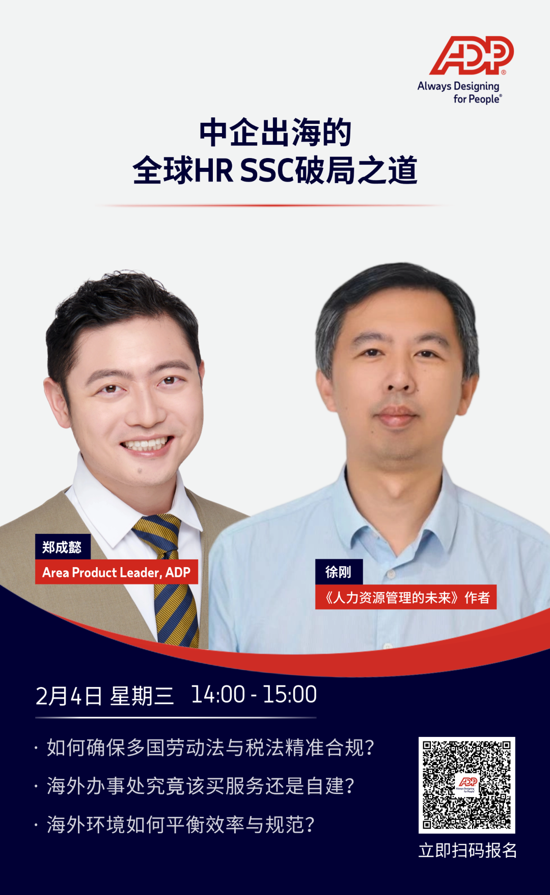 针对这些痛点,ADP特别邀请到了拥有丰富世界500强企业HR SSC领导经验的资深专家、《人力资源管理的未来》作者徐刚,以行家里手的敏锐视角与ADP全球解决方案专家郑成懿,基于ADP服务众多出海企业的最佳实践展开一场深度对话,为您深度拆解全球HR SSC建设的破局之道。