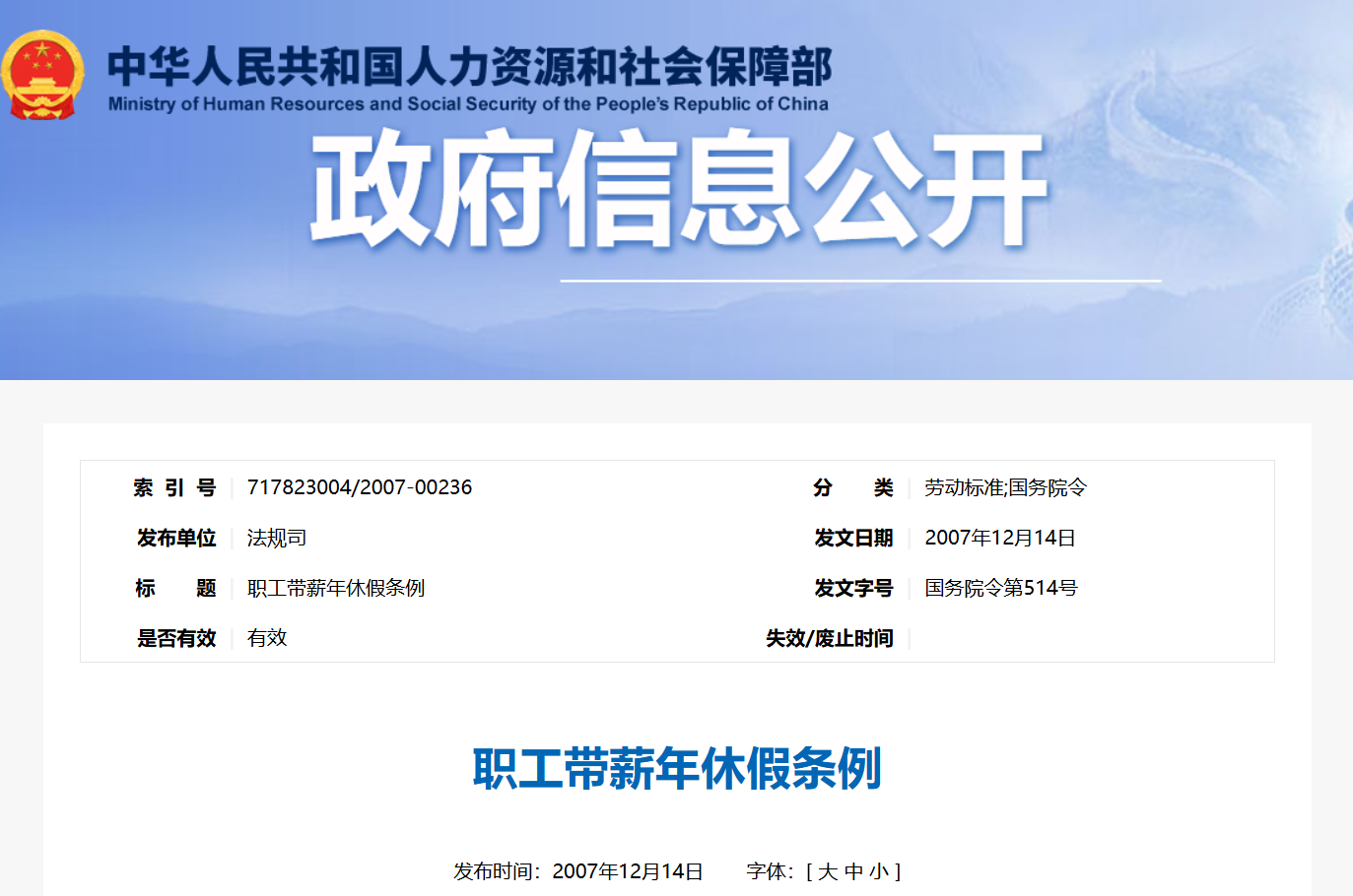 2007年12月14日中华人民共和国国务院令第514号公布自2008年1月1日起施行)第一条 为了维护职工休息休假权利,调动职工工作积极性,根据劳动法和公务员法,制定本条例。