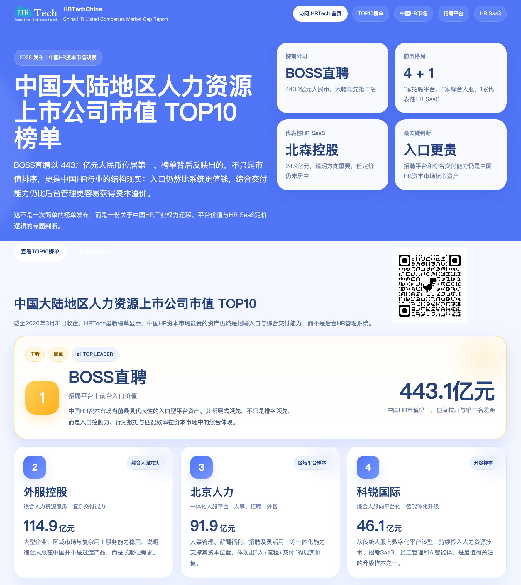 截至2026年3月31日收盘,HRTech本期榜单的前十名依次为:BOSS直聘443.1亿元、外服控股114.9亿元、北京人力91.9亿元、科锐国际46.1亿元、北森控股24.9亿元、同道猎聘11.8亿元、万宝盛华9.8亿元、人瑞人才5.5亿元、优蓝国际5.1亿元、云学堂1.4亿元。单看这组数字,最值得注意的不是第一名是谁,而是前五名的结构:第一名是在线招聘平台,第二到第四名是综合人力资源服务公司,第五名才是最具代表性的HR SaaS公司。这个排序本身已经说明问题:中国市场当前最高溢价的,不是后台管理系统,而是前台招聘入口与中后台综合交付能力。