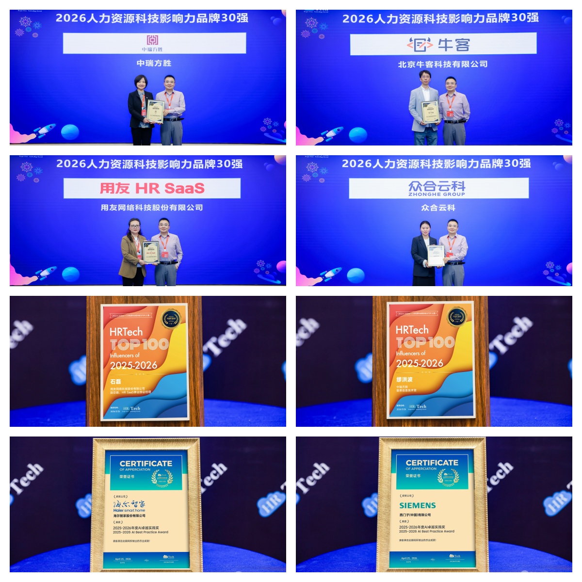 本次盛典现场揭晓了2026 人力资源科技影响力品牌30强部分获奖企业,同时延续颁发了此前在 3 月 26 日深圳 Inspire 人力资源科技发展趋势论坛上首发揭晓的