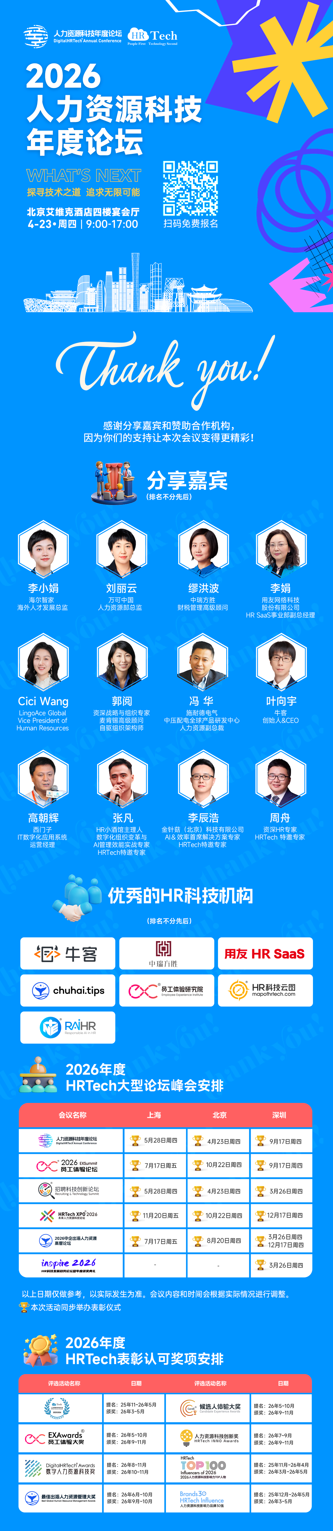 由HRTech主办的2026HR科技年度论坛北京站圆满落幕。衷心感谢所有分享嘉宾、合作伙伴和参会嘉宾的支持与参与!正是有了大家的共同努力与支持,中国人力资源科技论坛才得以如此成功举办! 期待下次相聚,让我们共同探讨更多前沿话题,共享更多行业智慧! 再次感谢所有演讲分享嘉宾和合作伙伴们的精彩呈现与大力支持!