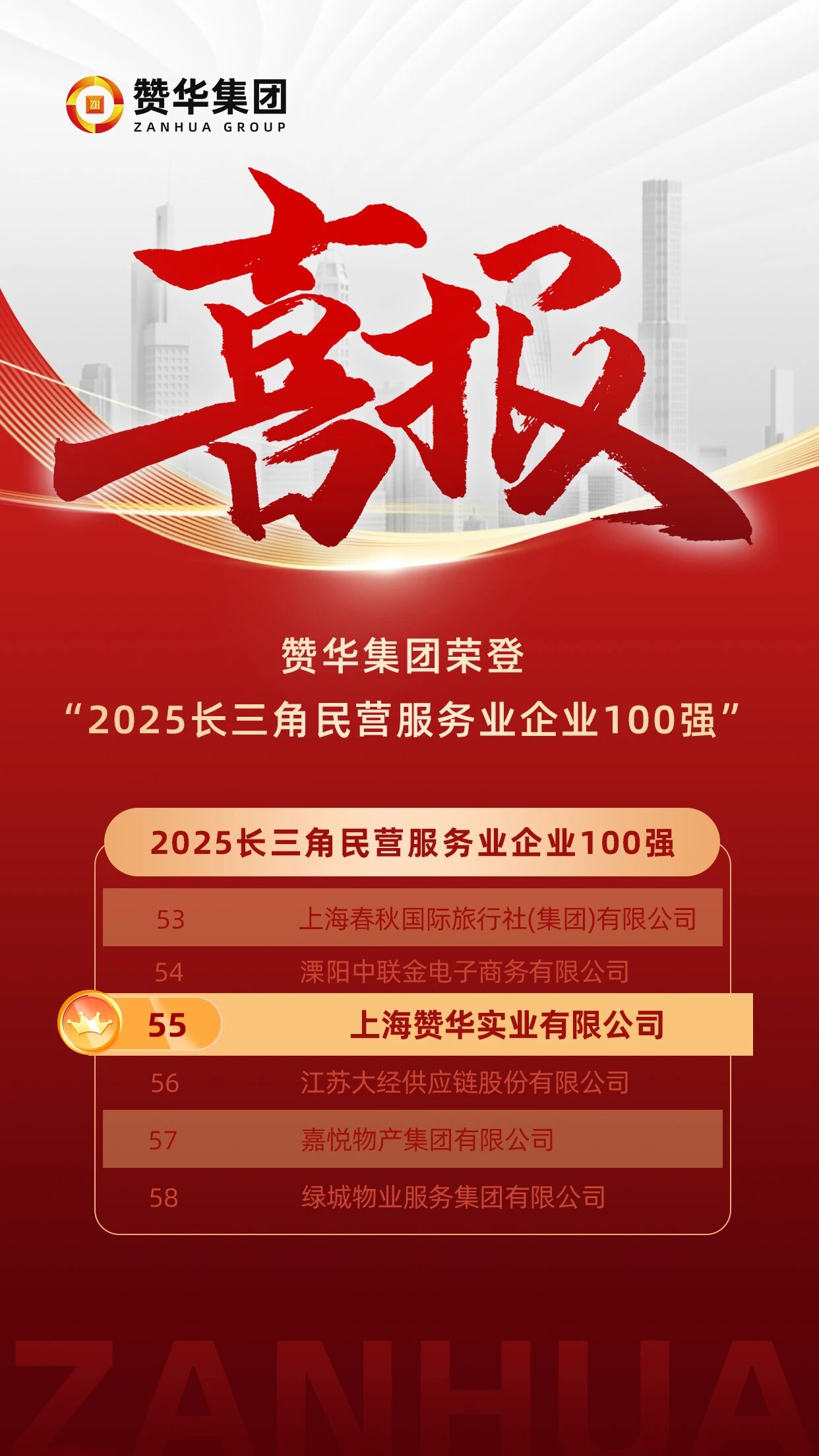赞华快讯 | 喜报!赞华集团荣登“2025长三角民营服务业企业100强”