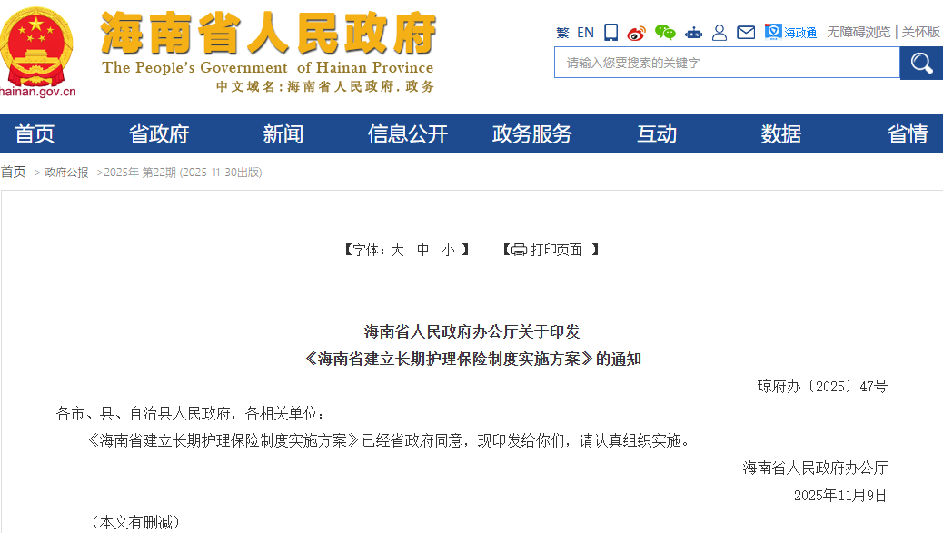 11月18日,海南省人民政府办公厅关于印发《海南省建立长期护理保险制度实施方案》的通知,自2026年1月1日起,海南省长护险政策统一实施,职工随城镇从业人员基本医保一同缴费,居民在2025年集中征缴期随城乡居民基本医保一同缴费。
