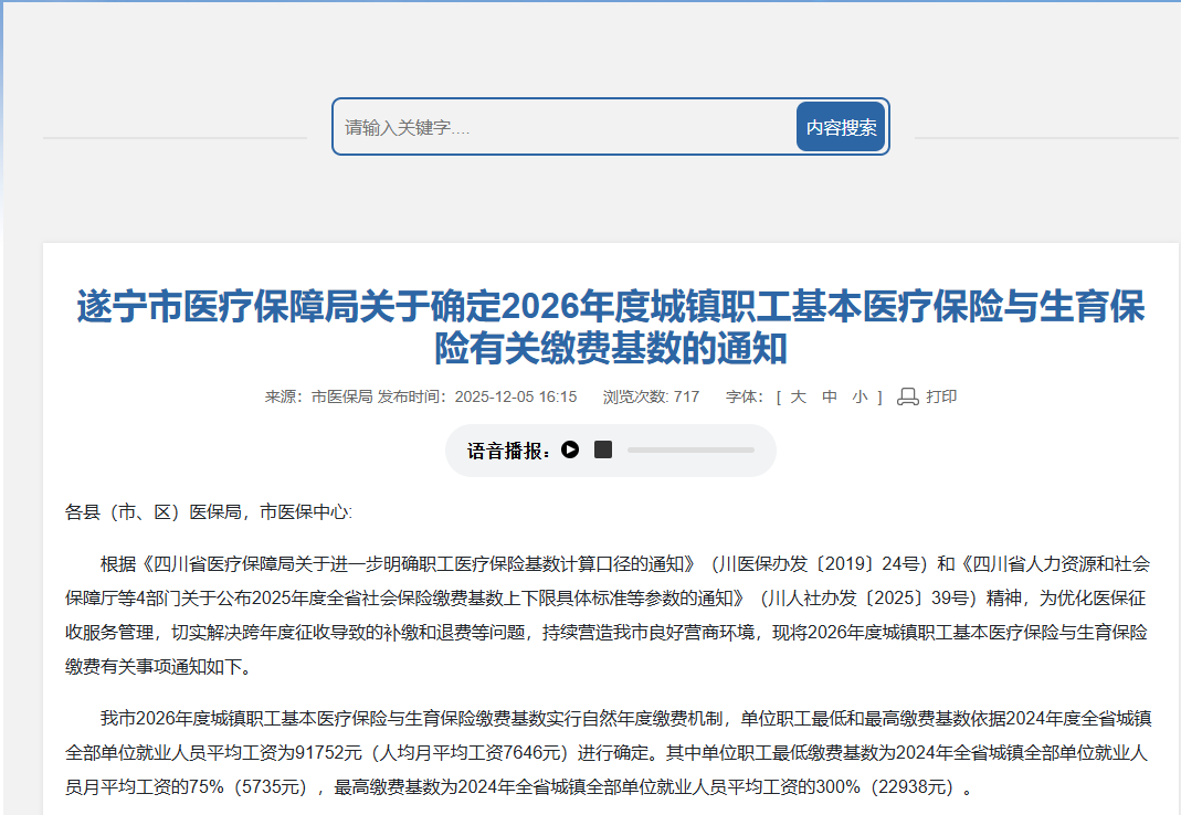 12月5日,遂宁市医疗保障局发布《关于确定2026年度城镇职工基本医疗保险与生育保险有关缴费基数的通知》,从2026年1月1日起执行。