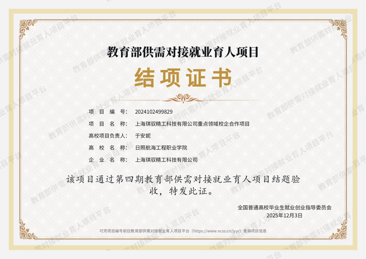 近日,赞华集团旗下子公司—上海琪驭精工科技有限公司(简称:琪驭精工科技)与日照航海工程职业学院、许昌陶瓷职业学院分别合作的第四期教育部供需对接就业育人项目成功结项,结项证书已正式下发。这标志着校企双方在产教融合、协同育人方面取得了又一重要成果。
