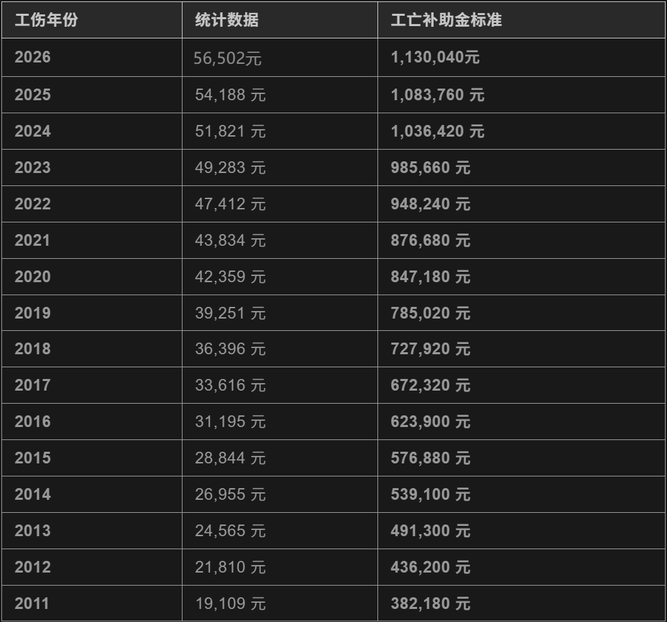 因《工伤保险条例》在全国统一执行,故2026年度一次性工亡补助金全国统一标准为1130040,相比上年度的1083760增加了46280。这个标准没有地域之分,全国统一。