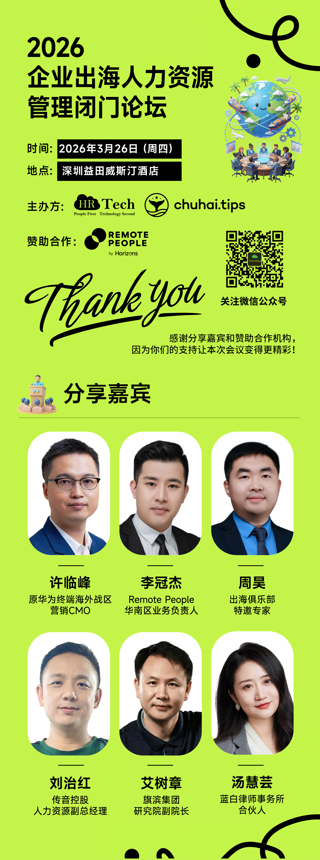至此,由HRTech主办的「2026出海人力资源管理高端论坛」深圳站圆满收官。印证了出海人力资源管理在企业全球化进程中的核心价值。从合规风控到跨文化管理,从战略规划到落地实践,出海 HR 正从 “事务性支持” 向 “战略引领” 加速转型,成为中国企业扬帆海外的关键护航力量。
