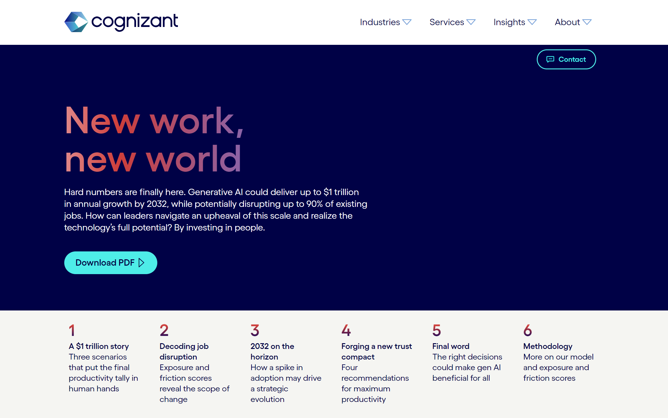 生成式人工智能有助于提高运营效率、创造新的收入来源、革新产品和服务,甚至重新定义企业。为了量化生成式人工智能对生产力和未来工作的潜在影响,Cognizant 与牛津经济研究院合作构建了一个经济模型,探究了美国企业采用生成式人工智能的三种情境。该模型考虑了推动美国经济发展的 18,000 项任务,并仔细研究了生成式人工智能可能对与这些任务相关的工作岗位产生的影响。虽然研究主要关注美国劳动力,但其发现的一般主题对全球都有参考价值。研究提出的主要观点包括: