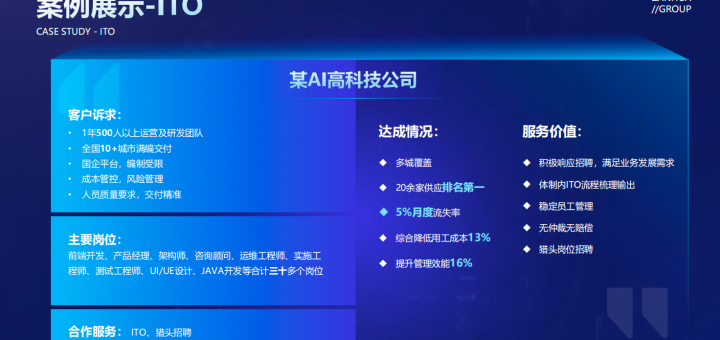 《2025年中国人力资源行业趋势报告》揭示了一个尖锐现实:78%的企业将技术人才短缺列为业务发展的首要瓶颈,而63%的管理者正重新审视人才获取策略。 当AI、云计算、大数据领域的人才需求以年均35%的速度攀升,传统招聘却困在45天平均周期与不足60%的成功率中。更深层的变化正在发生:人力资源管理正从“事务处理”跃迁至“战略引擎”,企业不再追问“如何省钱”,而是思考“如何让人才创造更大价值”。 正是在这样的时代拐点,技术人才外包(ITO)悄然完成角色蜕变——它不再是应急补位的权宜之计,而是企业构建敏捷组织、驾驭数字化浪潮的战略支点。麦肯锡调研显示,85%的科技企业已将灵活用工纳入核心人才战略,近半数将技术外包比例提升至三成以上。柔性、精准、可持续,成为新一代ITO服务的价值内核。 为什么ITO正在成为企业数字化转型的关键支点? 当生成式AI从概念走向产线,当云原生架构成为业务底座,企业正站在技术爆发与组织韧性的十字路口。Gartner最新预测:到2026年,75%的企业将因关键技术人才缺口延缓核心数字化项目。技术迭代周期已压缩至“月”级——大模型微调、MLOps流水线、数据编织、AIGC应用开发……这些前沿能力需求井喷,而内部培养体系难以同步。 与此同时,人力资源范式正经历深刻重构:从“岗位管理”转向“能力网络”,从“静态编制”走向“动态配置”。 赞华洞察:我们以“敏捷人才供应链”破局——依托覆盖50万+认证技术人才的“人才云”资源池,结合AI驱动的智能匹配系统,实现72小时内精准响应;通过“技术趋势雷达”机制,每季度动态更新12大技术领域能力模型,确保交付团队始终与行业前沿同频。当企业需要快速组建AIGC研发小组或云原生迁移团队,赞华ITO团队让“能力即服务”成为现实,将人才挑战转化为组织弹性。 赞华集团ITO:不止于“外包”,更是“战略伙伴” 在技术浪潮奔涌的今天,赞华ITO已迭代至“战略赋能3.0”阶段,打造“云-端-链”一体化产品矩阵与全周期服务优势。 1.全流程闭环保障:从需求诊断、人才筛选到交付后30天融入跟踪,建立标准化SOP与SLA,确保“招得准、用得好、留得住”; 本地化敏捷响应:全国200+城市设立交付中心,7×24小时专属客户经理在线支持,常规需求24小时内启动,紧急需求2小时极速响应。 2.行业深度定制:针对游戏、金融科技、人工智能、互联网、医疗科技等垂直领域沉淀解决方案库,输出《行业技术人才白皮书》,实现“懂业务、更懂技术”。 3.安全合规双认证:赞华集团通过ISO9001质量管理体系、ISO27001信息安全管理体系与CMMI-Level 3认证证书等多重认证,所有人员100%签署NDA并完成背景调查,筑牢数据安全防线。 4.价值可量化呈现:每季度提供《人才效能分析报告》,清晰呈现成本节约率、项目提速比、风险规避值、人才留存率等核心指标,让投入产出一目了然。赞华集团ITO业务交付服务流程图 赞华ITO深度融合“以流程为中心”与“以项目为中心”的双轮驱动交付模式,由SSC(共享服务中心)统一支撑岗位营销、简历筛选、面试甄选、入职管理、项目跟进及结项评估等全环节,确保标准化运作与个性化响应并行不悖。无论是长期驻场的技术团队,还是短期攻坚的专项小组,都能实现高效、稳定、高质量交付。 正如赞华服务理念所言:“我们交付的不是简历上的技能点,而是与业务同频共振的技术生命力。” 某AI高科技公司的数字化转型之路 某头部AI高科技企业需在一年内组建一支超500人的研发与运营团队,覆盖全国10余座城市。受限于编制管控、招聘流程复杂及严格的合规要求,客户亟需具备规模化交付能力与完善风控体系的ITO合作伙伴。赞华集团依托全国20+城市交付中心,快速启动项目,实现多地同步部署;通过智能匹配系统,精准筛选前端开发、架构师、测试、运维等30余类岗位人才,并由SSC中心统一支撑全流程管理,确保高效、透明、标准化交付。所有外包人员100%签署NDA并完成背景调查,全程实现零仲裁、零赔偿。 针对高端稀缺岗位,赞华同步提供猎头服务,高效引入关键技术专家,补齐核心能力短板,项目成果显著: 成功在全国10余个城市完成500+人技术团队满编交付; 在客户合作的20余家供应商中综合评分排名第一; 月度人员流失率控制在5%以内,远低于行业平均水平; 综合人力成本降低13%; 客户HR管理效能提升16%,释放更多精力聚焦战略事务。 此次合作不仅解决了客户的规模化用人难题,更输出了一套适用于体制内企业的ITO管理流程,助力其构建可持续、合规、高韧性的人才供应链。 客户技术负责人坦言:“赞华带来的不仅是人力,更是将行业最佳实践‘种’进了我们的技术基因里。”此次合作客户满意度达98.7%,复购率100%——这恰是战略伙伴关系的深层价值:赋能组织,而非简单交付。 趋势从不等待犹豫者。当技术演进速度超越组织适应能力,选择一位懂前沿、有沉淀、能共成长的伙伴,比单纯“找人”更为关键。赞华集团ITO服务,以“云-端-链”产品矩阵为基座,以全流程、本地化、行业化、可量化的服务优势为引擎,助力企业将人才挑战转化为创新势能。